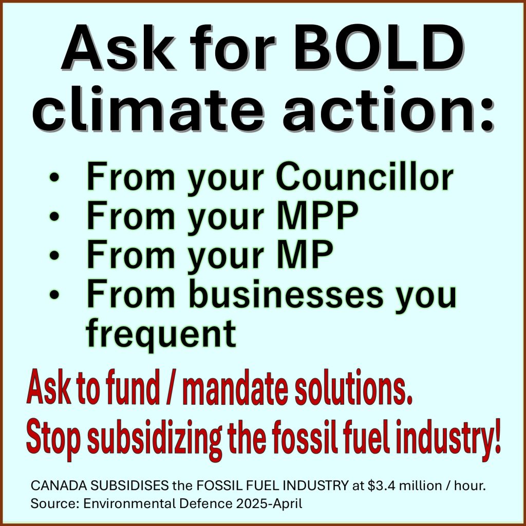 - Advocate to all levels of government (and businesses) for BOLD climate action – mandate switch to non fossil fuel cars and trucks, stop subsidizing the fossil fuel industry, ban new natural gas hookups for heating / cooking / water heating, upgrade building standards, electrification of public transit, reduction of disposable plastics,…