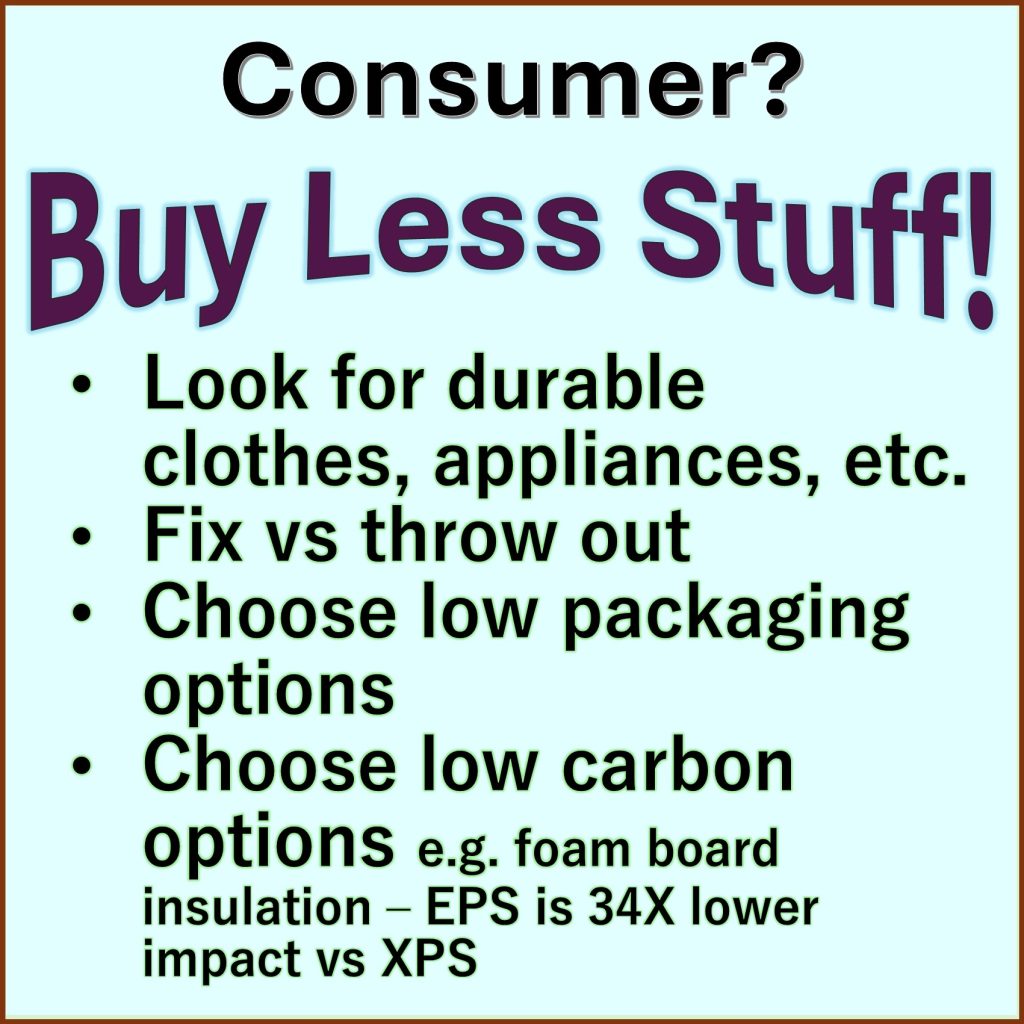 - Buy less stuff (eg. clothes); buy second hand; fix vs replace