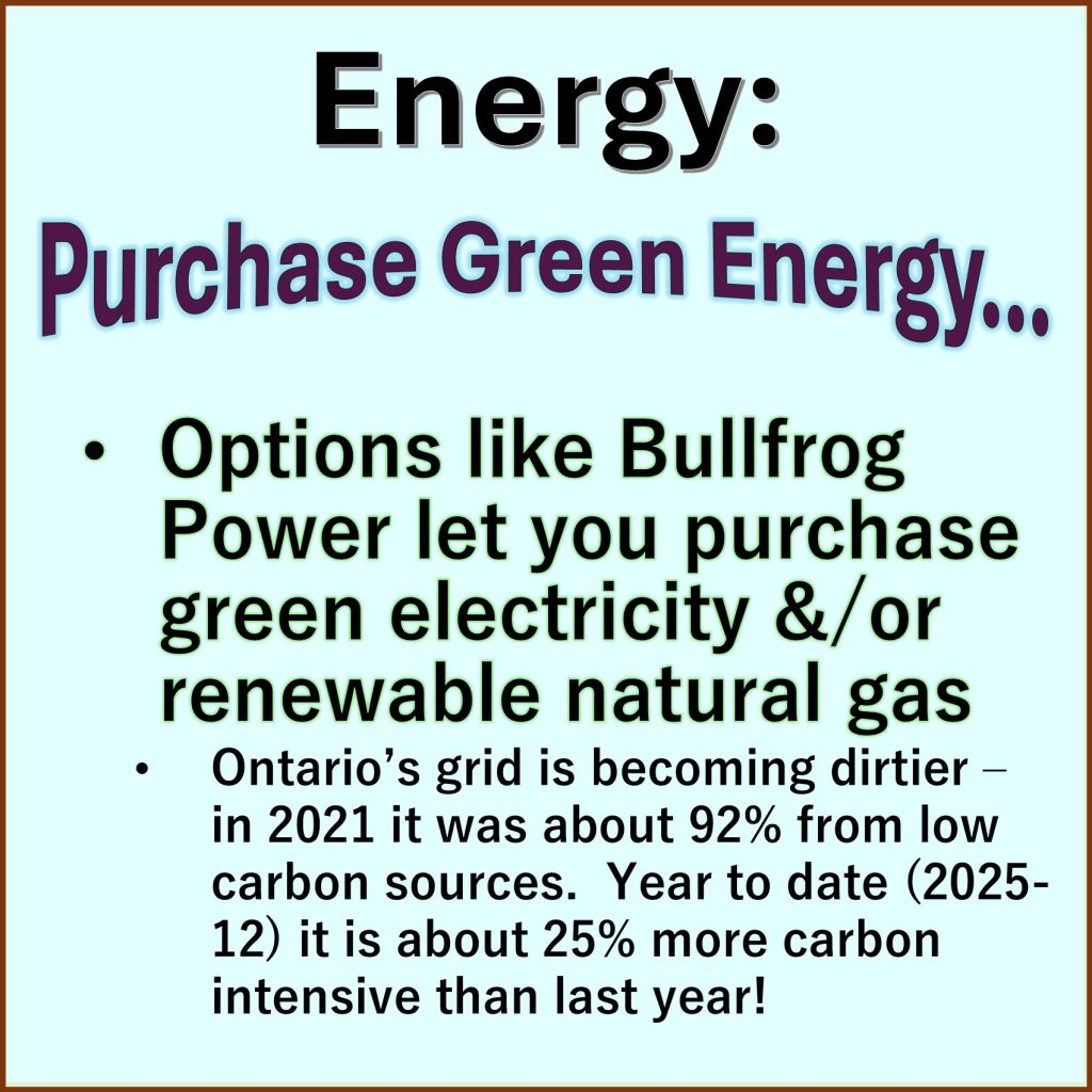 * Explanation: Bullfrog Power for electricity is a good option for dealing with the roughly 10% of Ontario’s electricity that is carbon emitting. They fund renewable energy so that your electricity is essentially carbon free. (Given how the grid works it may be some other users that are getting the renewable energy but the net effect is the same). Some people don’t like the fact that it is a private company that makes a profit, but the process is audited and at the end of the day it is getting renewable energy brought on line.